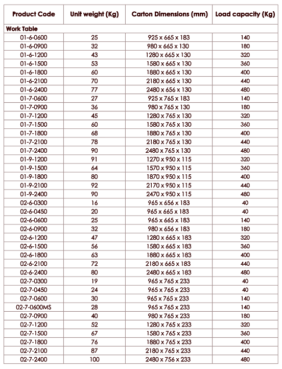 - 1800, 2100 & 2400mm length units supplied with 6 legs